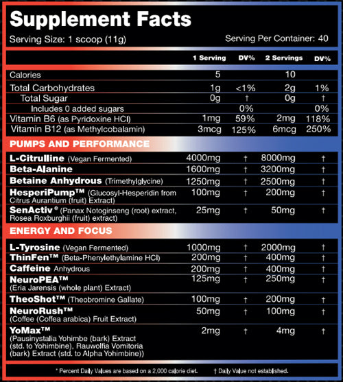 We’ve also included a full 2,000mg of L-Tyrosine -- an amino acid that serves as a “building block” for important neurotransmitters and catecholamines, including dopamine and noradrenaline. Providing the “finishing touch” on our Energy & Focus matrix is the powerful trifecta of 200mg TheoShot™(Theobromine Gallate), 100mg NeuroRush™(Coffee Fruit Extract), and 4mg YoMax™(Alpha Yohimbine/Yohimbine complex), which are included to further heighten mental energy, giving you the ability to push for that “sixth gear” in your workouts when it’s needed.*