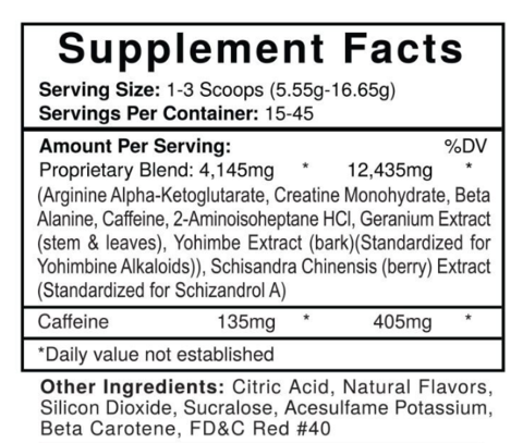 (Arginine ALpha-Ketoglutarate, Creatine Monohydrate, Beta Alanine, Caffeine, 2-Aminoisoheptane HCI, Geranium Extract (stem & leaves), Yohimbe Extract (bark)(Standardized for Yohimbine Alkaloids)), Schisandra Chinensis (berry) Extract (Standardized for Schizandrol A)